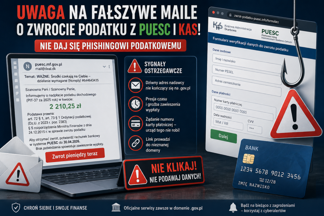 Pojawiła się nowa kampania phishingowa, w której cyberprzestępcy podszywają się pod Krajową Administrację Skarbową i platformę PUESC, obiecując szybki zwrot podatku. Fałszywe maile wyglądają profesjonalnie, wykorzystują presję czasu i prowadzą na strony wyłudzające dane osobowe oraz numery kart płatniczych. [niebezpiecznik](https://niebezpiecznik.pl/post/uwaga-na-e-maile-o-zwrocie-podatku/)